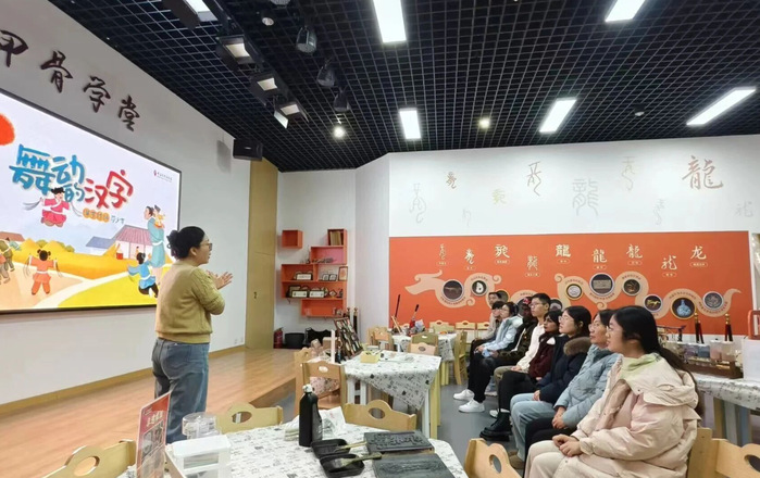 在南京特殊教育师范学院与安阳幼儿师范高等专科学校教师的共同带领下,师生们走进中国文字博物馆宣文馆,循着汉字发展的历史脉络开启文化之旅。从序厅《一片甲骨惊天下》专题展览,到《字法自然》《甲骨纪事》《钟鼎千秋》等文字发展史展厅,大家通过珍贵文物与现代化展陈,系统了解了汉字从甲骨文到现代汉字的演变历程,深刻感受到中华文明绵延不绝的精神传承。在文字发展史各展厅,中外学子驻足热议,围绕甲骨文的造字智慧、金文的纹饰寓意、汉字简化的历史逻辑等话题交流见解,对中国文字绵延数千年的多元发展轨迹与生生不息的时代生命力表现出了浓厚的兴趣。