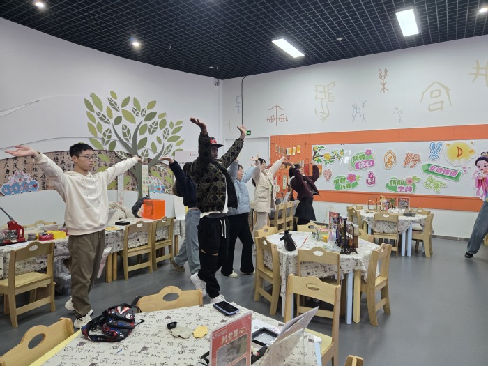 在互动体验环节,中国文字博物馆培训科杨小玉老师为同学们举行了《舞动的汉字》教学。甲骨文韵律操将“人”“女”“舞”等文字形态转化为生动的肢体动作,让传统文化在运动与音乐中焕发新意。随后开展的《舞动的汉字》教学,通过对比甲骨文与现代汉字,引导学生在字形变化中理解“谦恭有礼”“团结协作”“勤劳务实”等中华传统价值观。